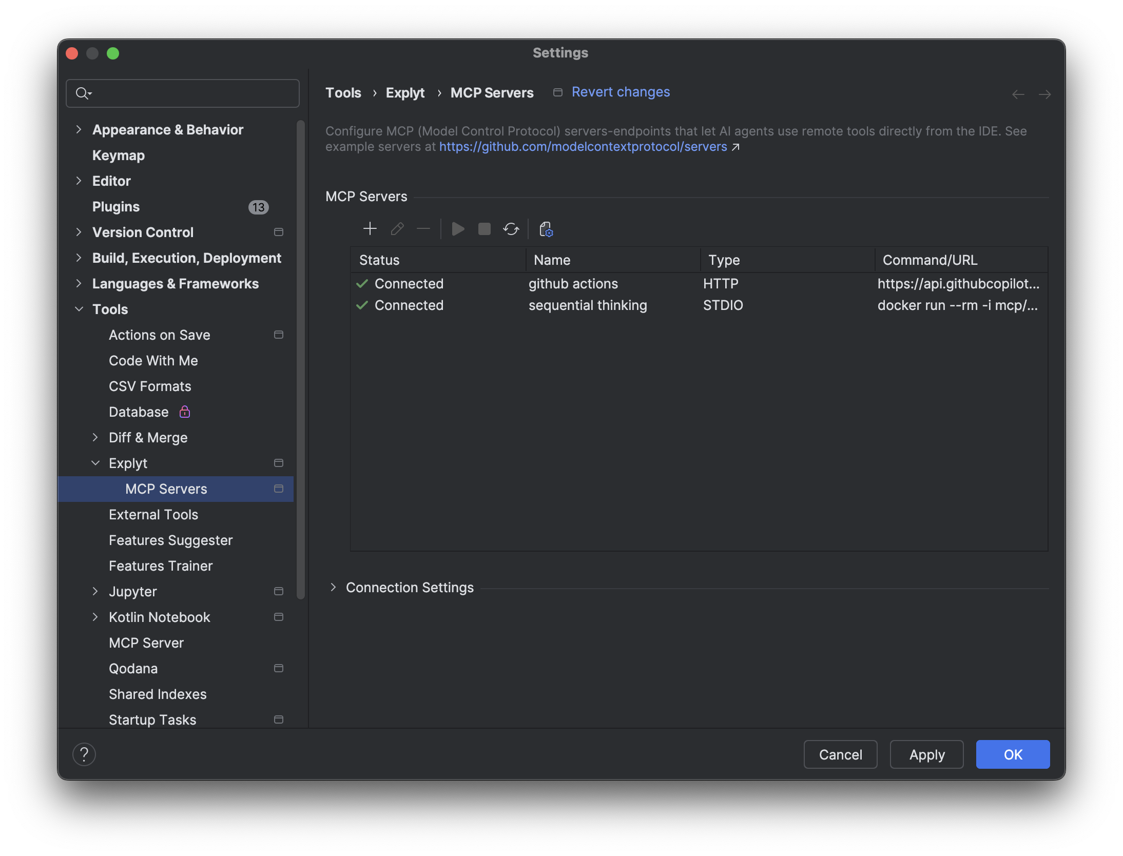 repopermissions. - In the IDE settings, go to Explyt, MCP Servers and click the "Update" button.