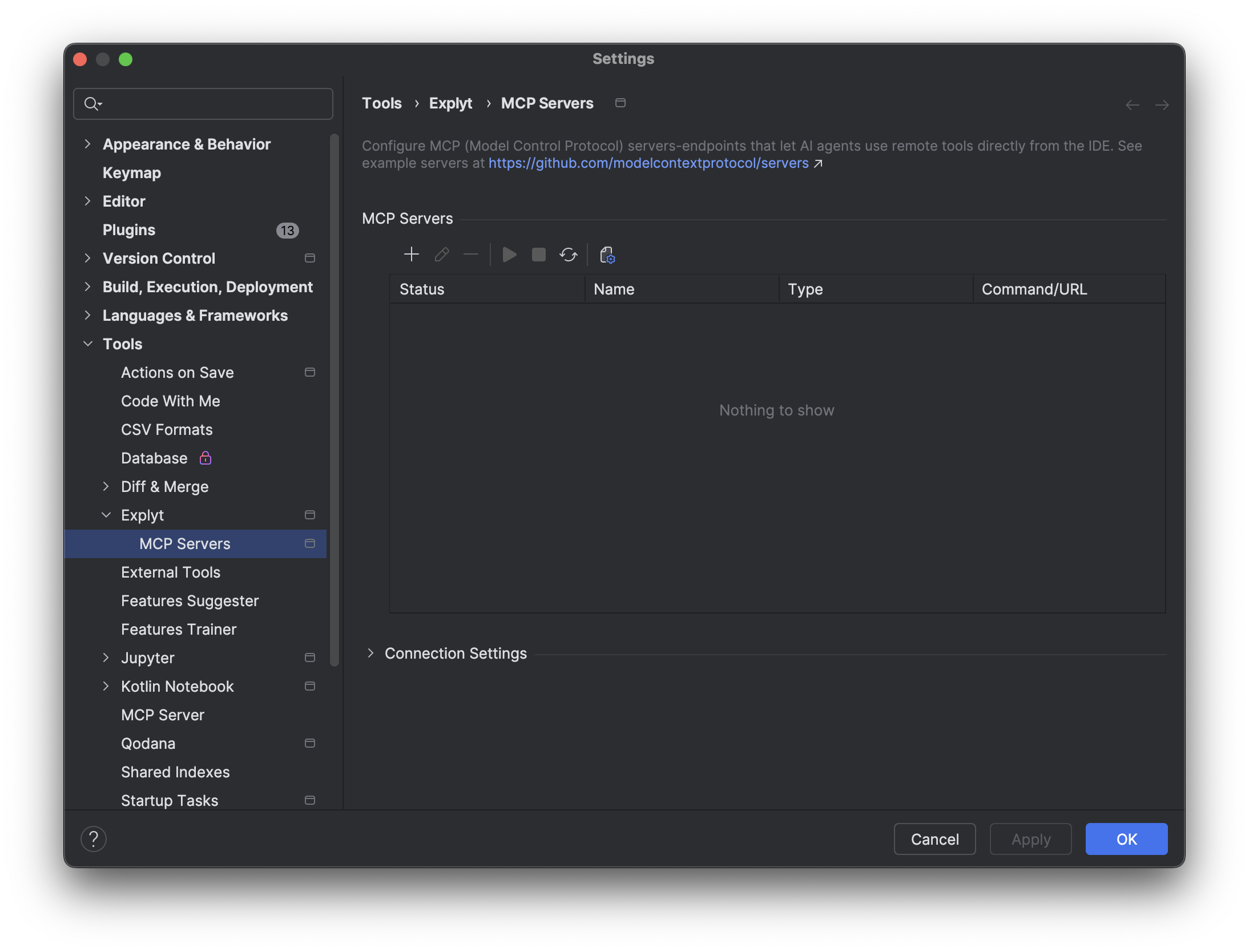 To connect MCP server in the Explyt Plugin, open the IntelliJ IDEA settings and go to Explyt -> MCP Servers.