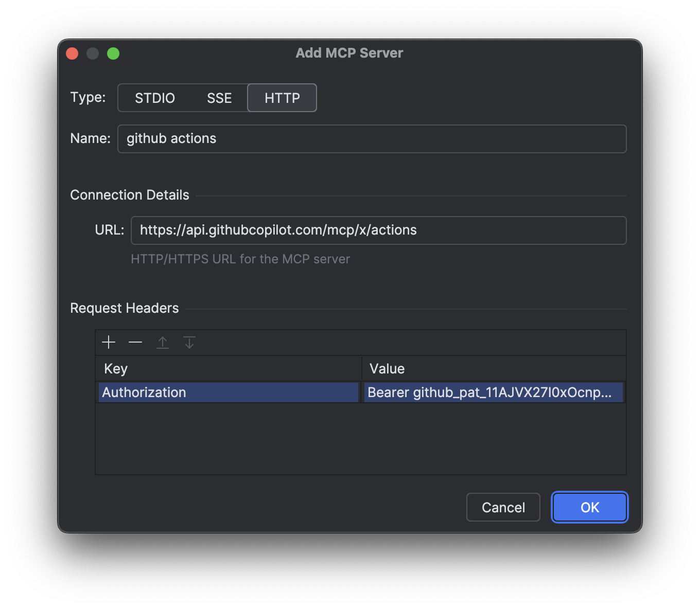 For network connections, enter the URL of the desired MCP server in the corresponding field. Some servers require authentication via Bearer or other methods. To connect, obtain the necessary key and specify it in the "Request Headers" section: