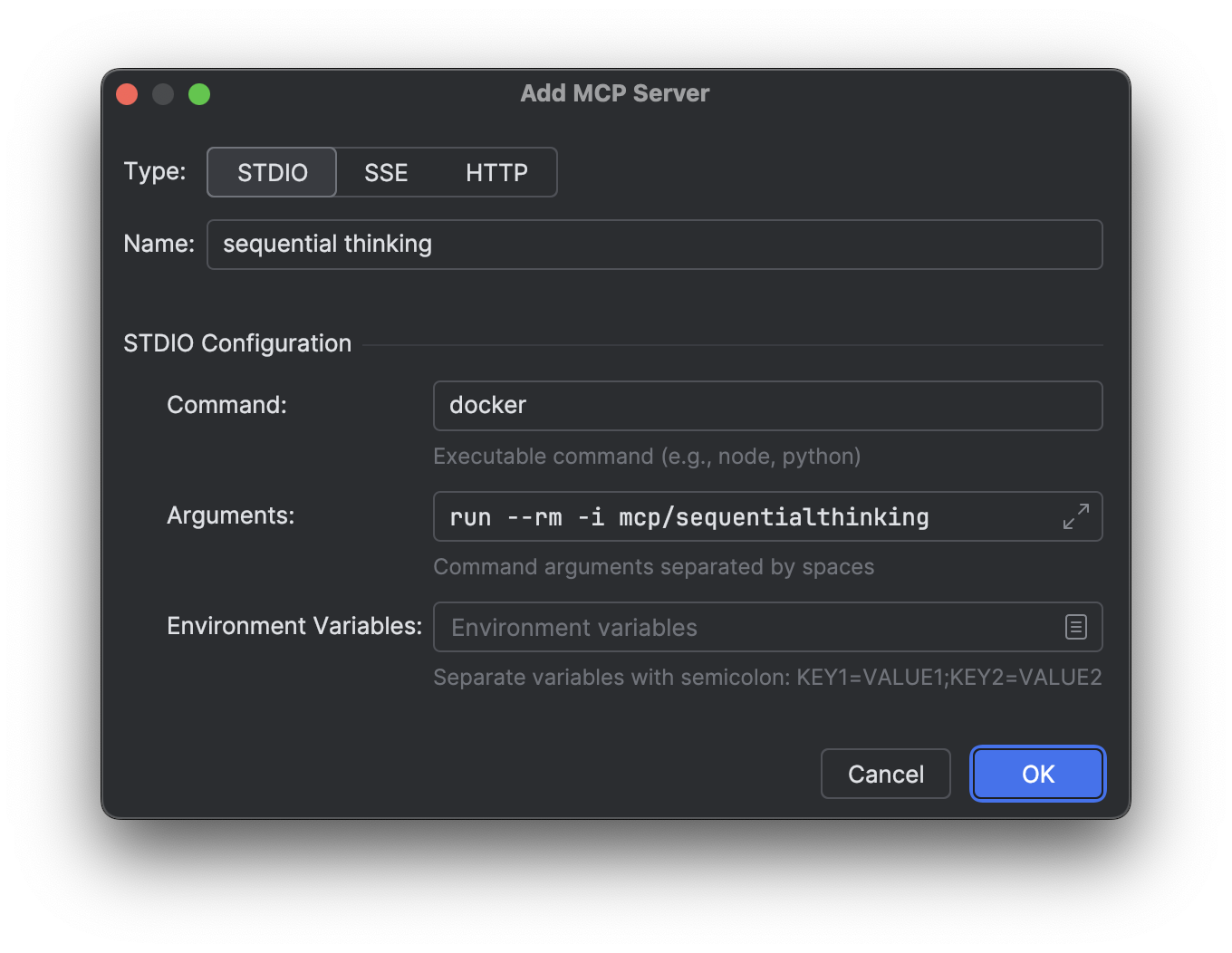 STDIO (Standard Input/Output) is mainly used for MCP servers running locally. This command should start the MCP server on your machine. Before connecting, make sure the startup command runs successfully (for example, that the Docker image is downloaded and starts correctly with the required arguments).